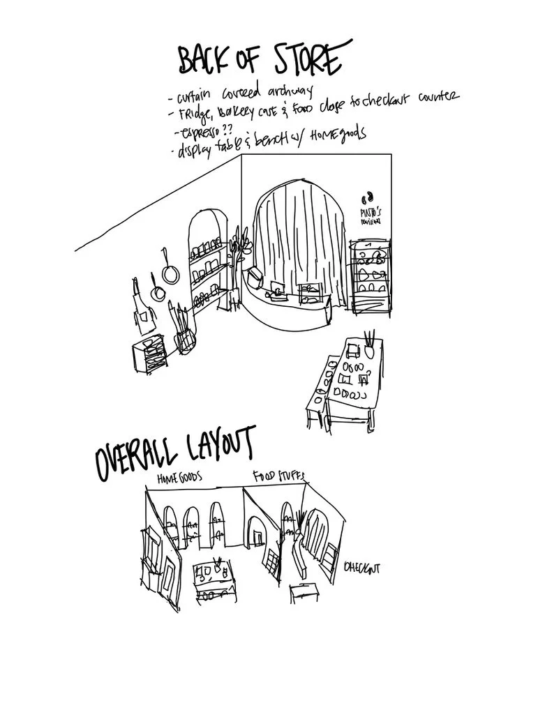 I imagined this space as an off-shoot of Bar Pinto, a project I worked on in 2024. The restaurant got popular and decided to open up a home goods and food market, right across the street.